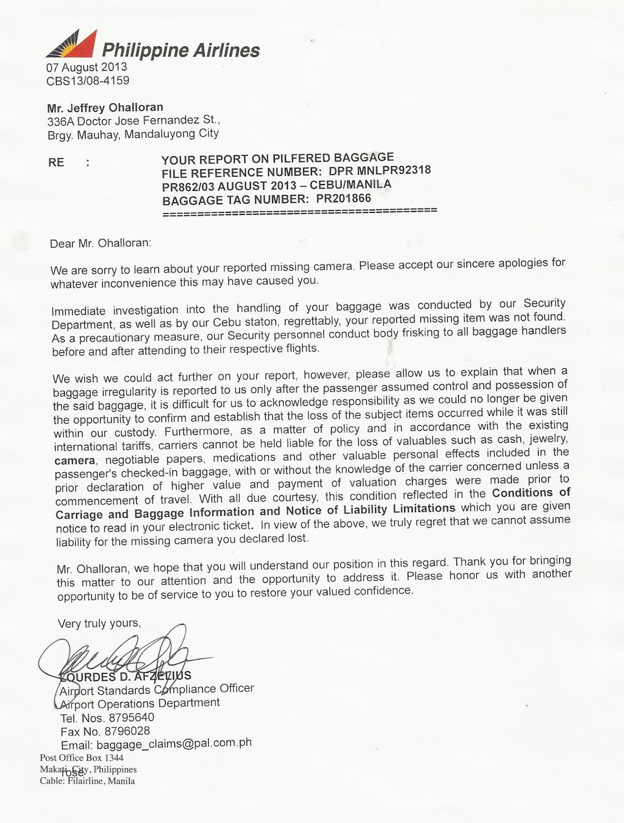 In their letter, they have insinuated that I am basically dishonest and making a claim purely for monetary gain. I have made no such claim for the items stolen by Philippine Airlines staff whilst in the custody of Philippine Airlines. My question relates not to the stolen items but the process that allowed my and other people’s baggage to be rifled through by Philippine Airlines staff. I highlighted the fact that the baggage had been tampered with and items are missing.