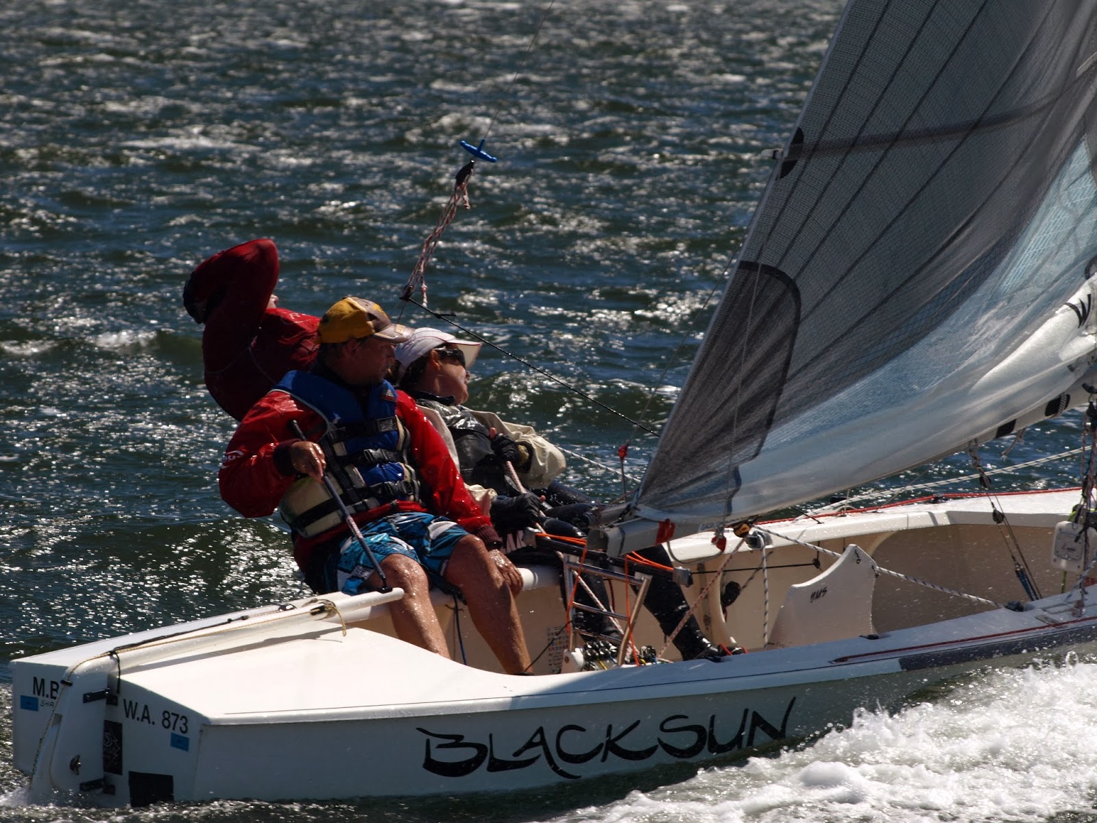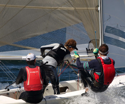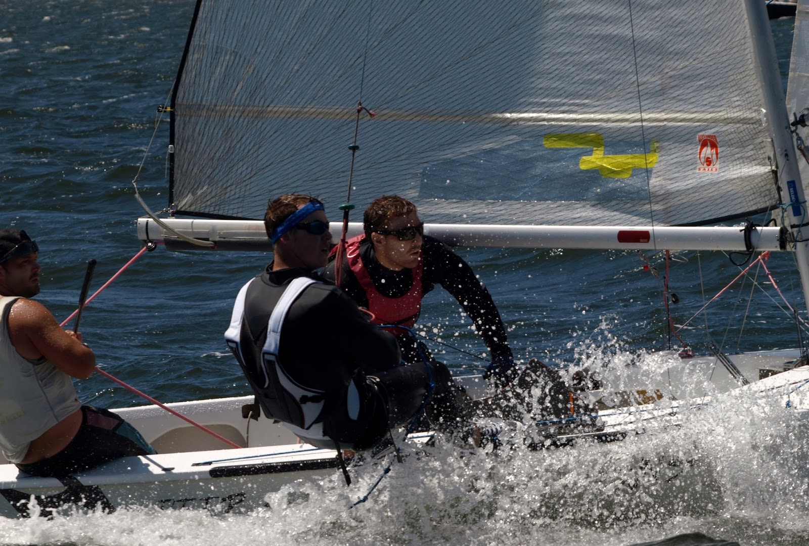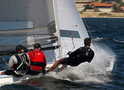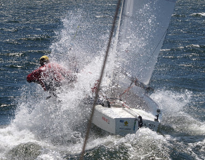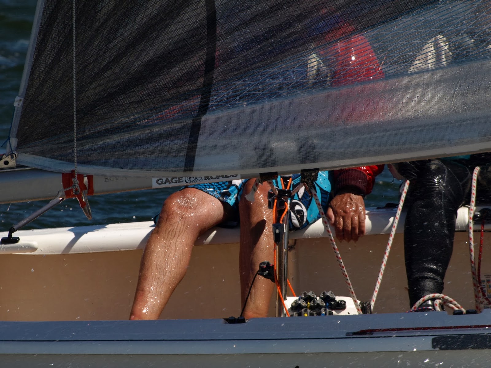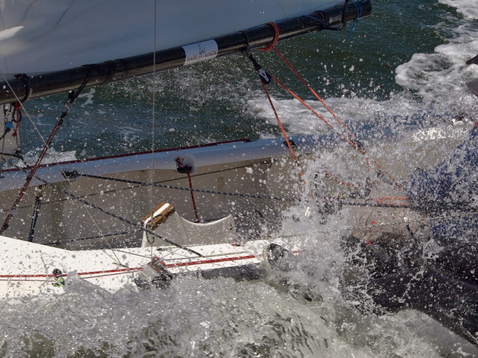 Punching through the chop proved to be hard for some who were unfamiliar with such conditions, difficult to keep the boat fast and level. The forward hand low to the water is fast, because of the chines on the hull, these boats sail fastest when the hull is flat in the water.