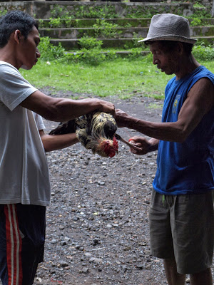 I have spent a fair amount of time in parts of Asia/Pacific over the years and was invited to many cockfights. I always declined as this sport is cruel and barbaric, it is, of course not a sport but a fight to the death with a razor sharp knife strapped to the left leg of the bird. I had always thought the knife was strapped to the right leg but since this was the first time I had seen a live fight, I stand corrected.
