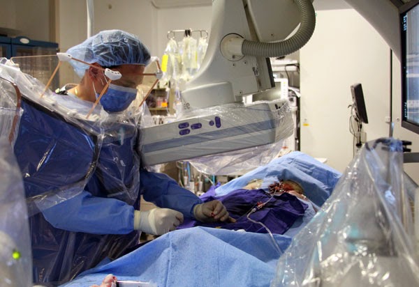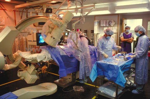 They were working from 6 large flat screen monitors, there was a team following monitors in the adjoining room, they were calling out to each other, there was another team behind me to my right, I was not sure what they were doing, there was some chatter among them at certain times. Throughout the procedure, the x-ray head was swung across, the lights were dimmed and out of the corner of my eye I could see an orange light on the screen mount light up.
