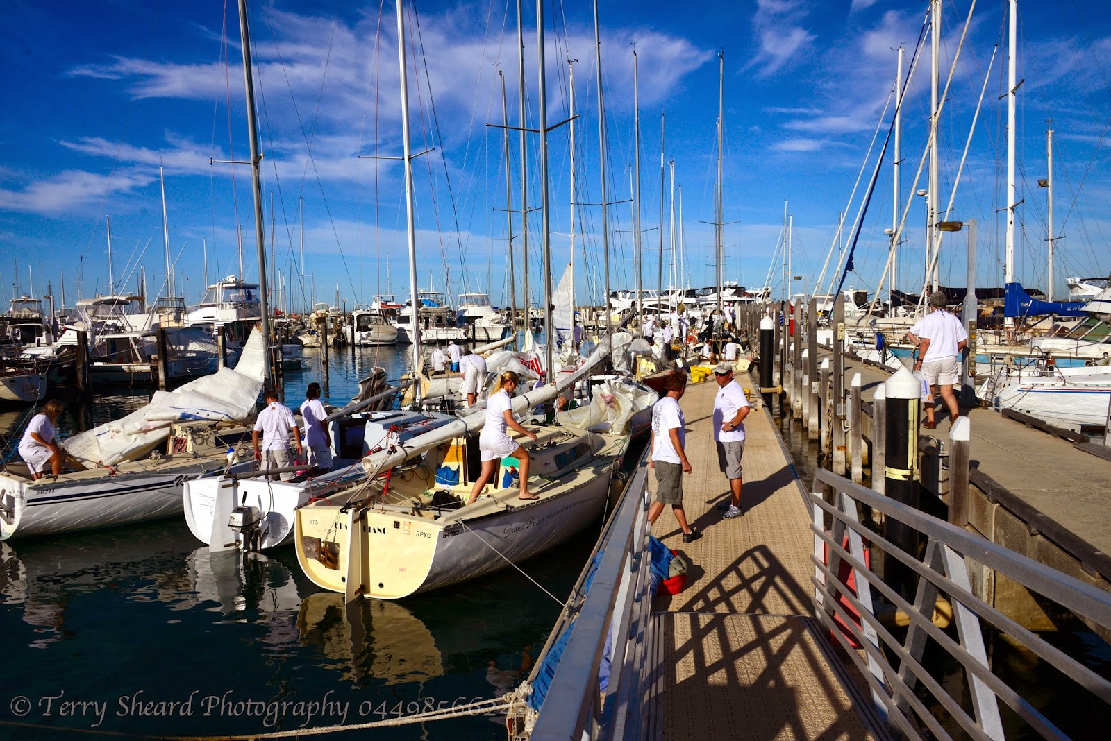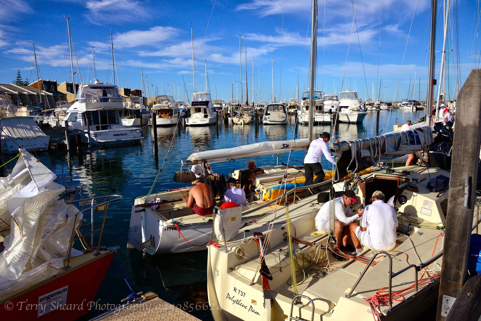 Rigging the yacht in the marina pre-race; the Royal Perth Yacht Club Fremantle annex requires yachts to be tied together, it makes rigging a little cluttered but very sociable.