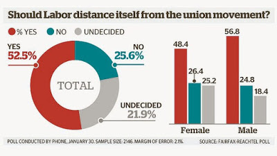 The Fairfax/Reachtel poll tells us in round figures that about half of all respondents want the Australian Labor Party to distance itself from the union movement. However, this will not happen as the union movement funds political advertising for both the Australian Labor Party and the Greens with enormous political donations, this is where a large part of union member’s payments are spent.
