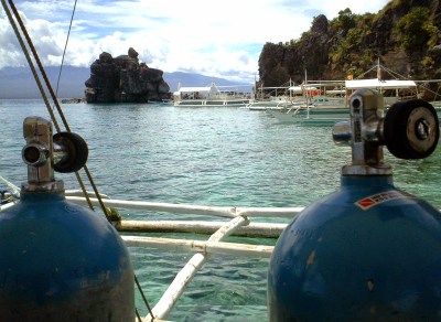 The outrigger style banca boat is common throughout the Philippines; I love diving from these boats with their outriggers lashed together with fishing line keeping the narrow hull stable. Landing on Apo Island after the first dive, we took our lunch on the banca before heading over to wander the beach and look around the village.