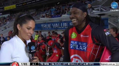 After another stunning knock for the Melbourne Renegades, international T20 player Chris Gayle was pulled up boundary side and interviewed by Network Ten sports reporter Mel McLaughlin. While people will draw their own conclusions over Gayle’s remarks, I thought they were made in jest with a smile on his face. He livened up what was bound to be another boring interview.