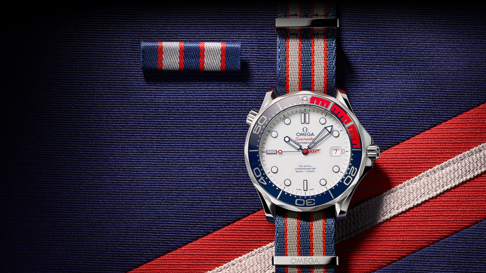 Omega had the chance to design something special, the white face is different to the existing series, the scalloped bezel is standard Diver 300 with ceramic insert. I have never been a big fan of the NATO strap but on this occasion I think it works, the colour scheme is related to the military insignia. What really irks me is the 007 counterweight on the second hand; to my thinking, this is really crass and this single feature prevents me from ever purchasing this timepiece.