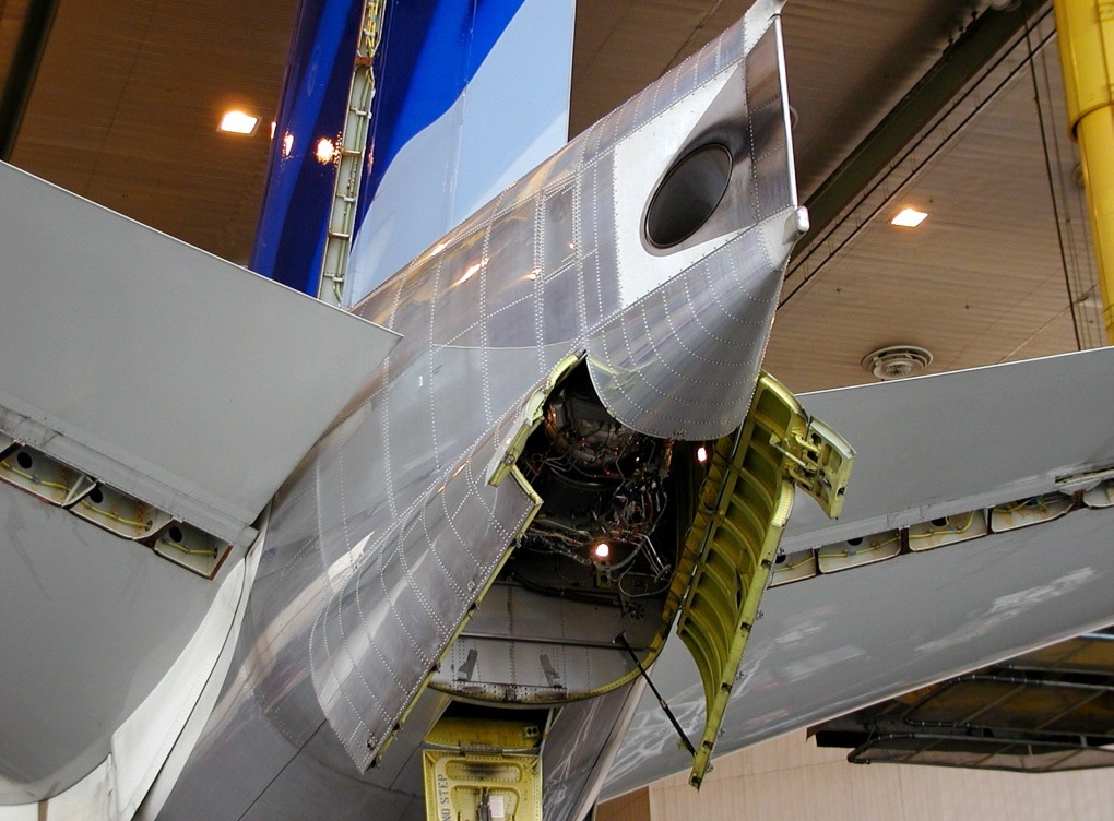 The auxiliary power unit (APU) on a commercial airliner is mounted in the tail at the rear of the aircraft, this turbines runs when the aircraft is on the ground.