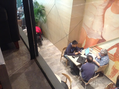 Sitting upstairs, I can look around and look over the edge and watch business deals going down. Looking around on the upper level, I am listening to business jargon being loudly thrown around, spreadsheets scattered recklessly over tables and sales pitches. During the day, the Coffee Bean & Tea Leaf is a hive of activity, coffee and sometimes cakes consumed and deals negotiated. I believe a cafe is a perfect location for business meetings, most amicable, some not so with tempers flaring and voices raised and I am enjoying being in the centre of it.