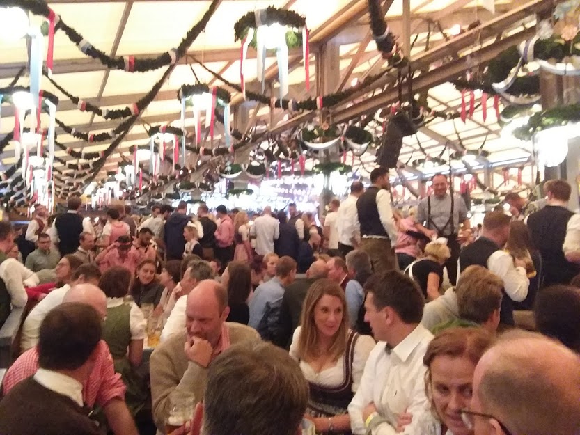 So we wandered into a couple of beer halls, by this time of the day getting a seat was near impossible. The beer halls were full and festivities were well under way, there was music playing, people singing along with plenty of pushing and shoving. All of the major breweries had their own pop-up beer hall, so you could choose the beer of your choice. I decided to take a couple of drinks outside at Lowenbrou, can’t say it is my favourite beer but as it turned from day to night, better to be somewhere.