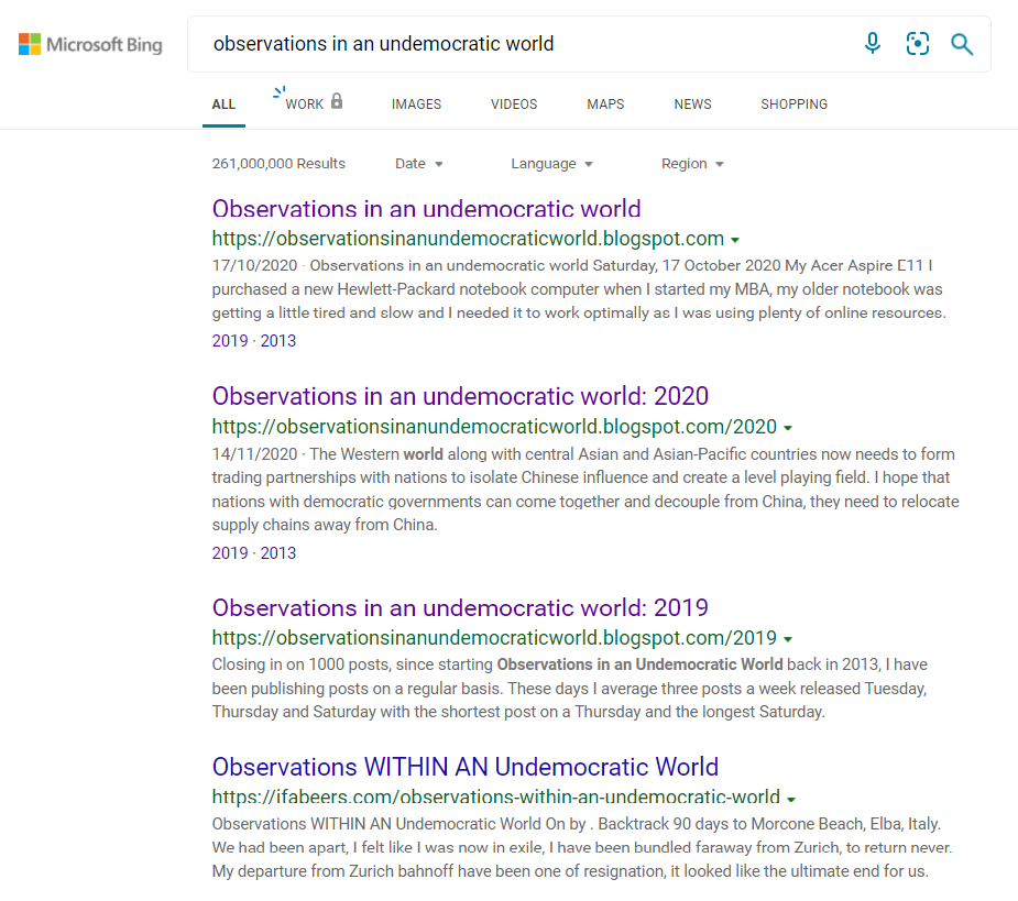 What really annoys me is when I type in a search such as observations in an undemocratic world, even plagiarised content is displayed as the fourth option. This really grates on me, if you Google the same name then you get original content. To be fair, since I also link to Pinterest, two pages of Pinterest pins are displayed. However, this leads to the original content and may include Tumblr links too – just so much better.