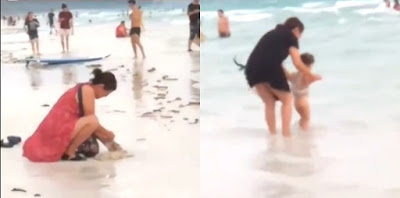 What were these women thinking? How could you not only change the shitty nappy (diaper) of your child on the beach with everyone around, you try to bury the soiled nappy where people are relaxing. This is a terrible hygiene problem, the tide will come up, uncover the nappy and drag it out to sea. Sure, the problem is over for you but the ramifications are long lasting for everyone else. This isn’t difficult if you are not a self-centred arsehole – clean up after your child.