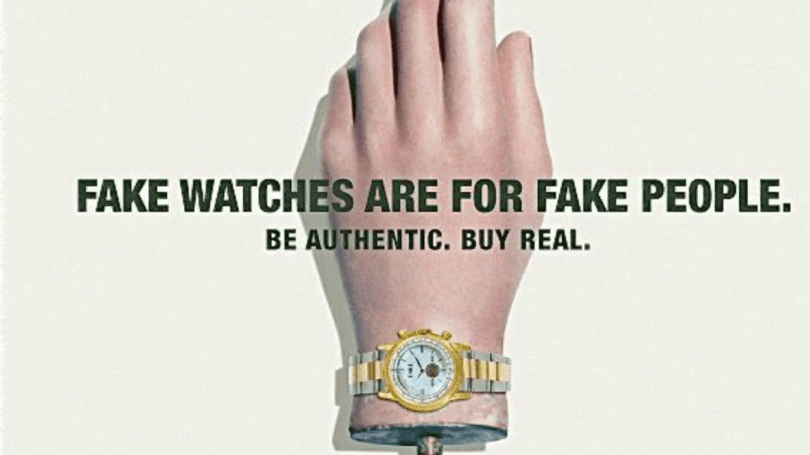 Fake watches are for fake people, that’s a pretty harsh assessment, probably not the negative advertising I would want to be associated with. So where did this advertising originate? Well, Fondation de la Haute Horlogerie [FHH] is an advisory board with the intent to promote watchmaking that is located in Geneva. This think tank engages in education, promotion and certification. The Federation of the Swiss Watch Industry [FHS] is to protect and promote the Swiss watch industry and is headquartered in Bienne, Switzerland.